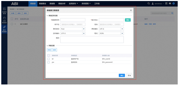 在数据源模块的“接口数据源”下,点击“新建”,弹出“新建接口数据源”对话框。
