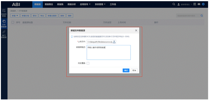 点击“EXCEL”之后会弹出“新建文件数据源”对话框,在对话框中上传需要的EXCEL文件数据源,并填写描述信息。